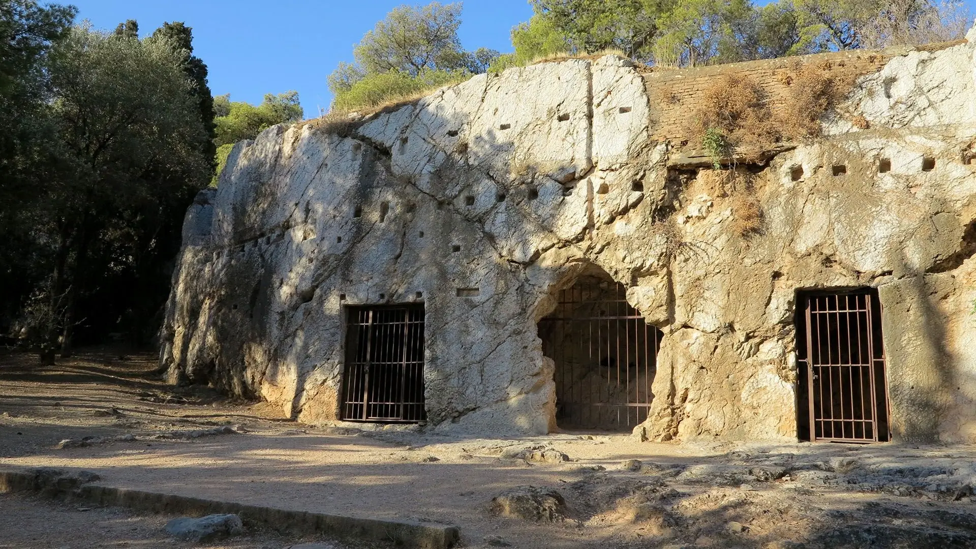 Prison of Socrates ; This rock cave, its entrance covered with iron bars, is believed by many to be where Socrates spent his final hours before drinking the fatal poison.