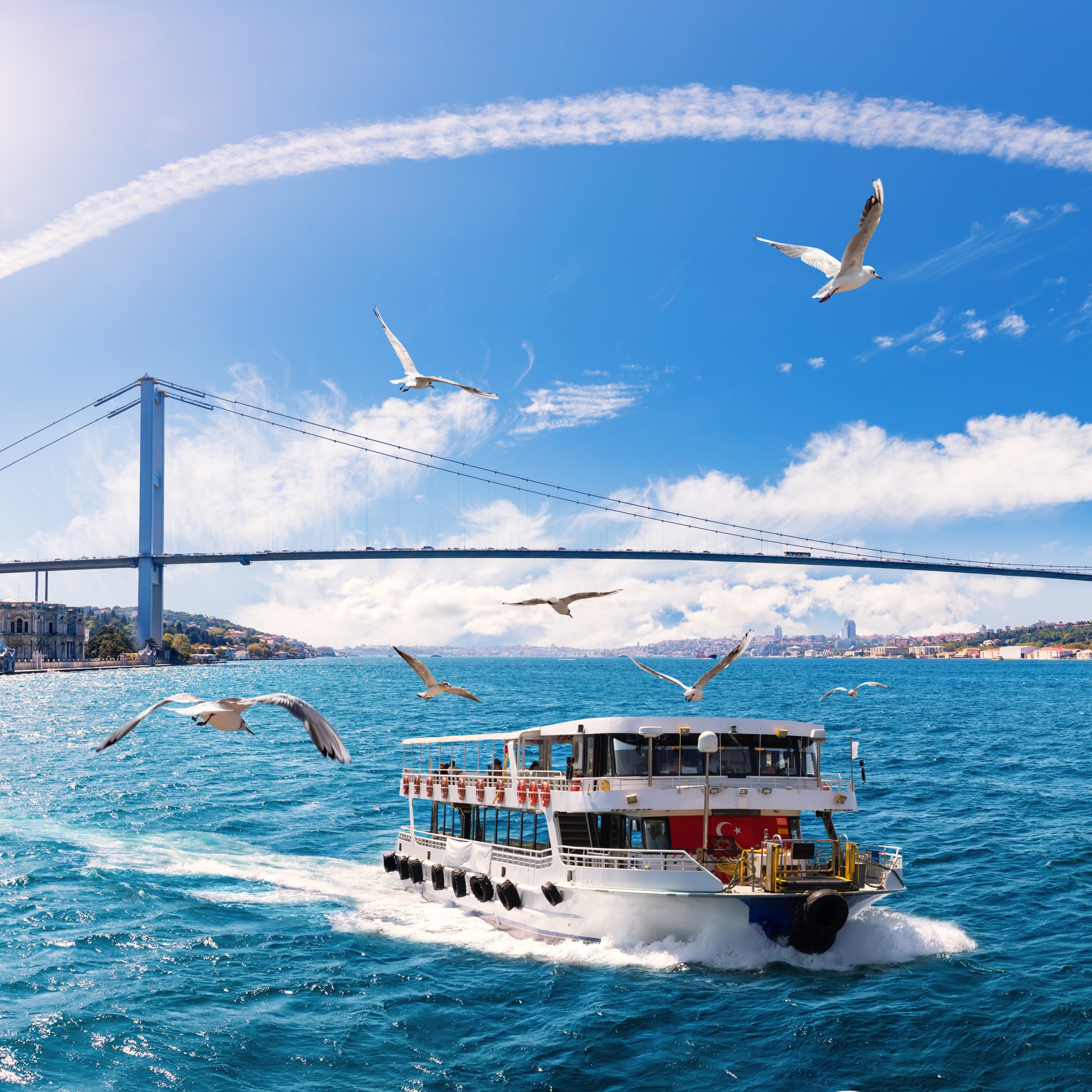 Your guide will meet you in the hotel lobby at 08:30 or 09:00 AM. You'll then take public transportation to the port for a 10:00 AM. tour boat, sailing the Bosphorus for about 1 hour and 45 minutes, passing the second bridge and connecting Europe and Asia. Experience an unforgettable cruise alongside the Dolmabahçe and Beylerbeyi Palaces, wooden villas, and the Rumeli Fortress (no interior visit). Istanbul, besieged many times before 1453, defended its Roman walls successfully.