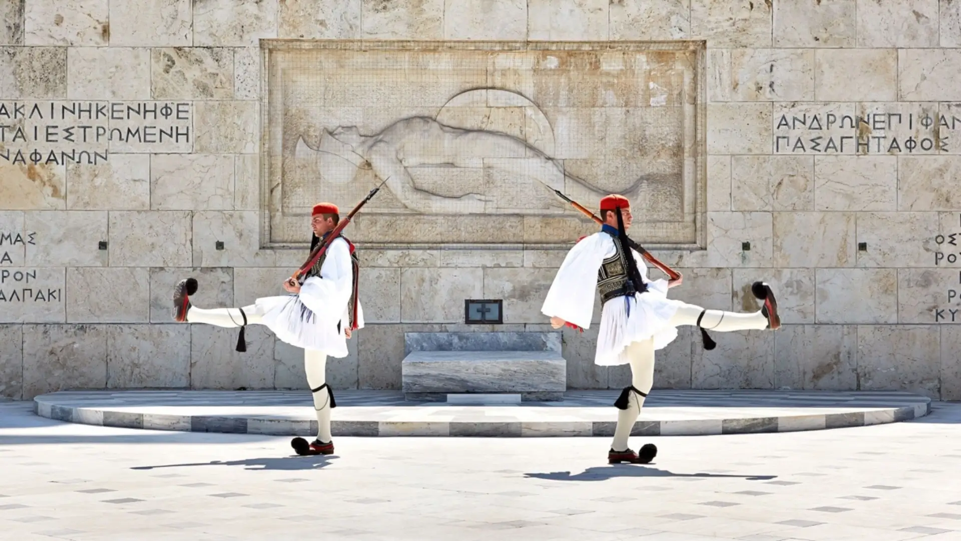 The Changing of the Guards ; Changing of the Guard ceremonies take place at the Presidential Mansion and at the Tomb of the Unknown Soldier, which is at Syntagma Square below the Hellenic Parliament.