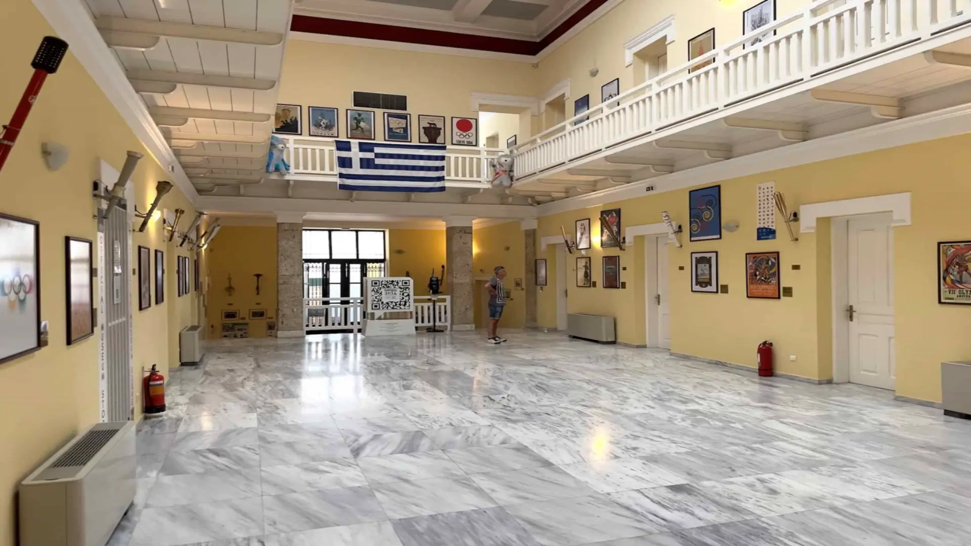 Panathenaic Stadium Museum ; The walls of the museum and stairwell are lined with official posters and torches used at modern Olympic Games. Both summer and winter Olympics are represented.
